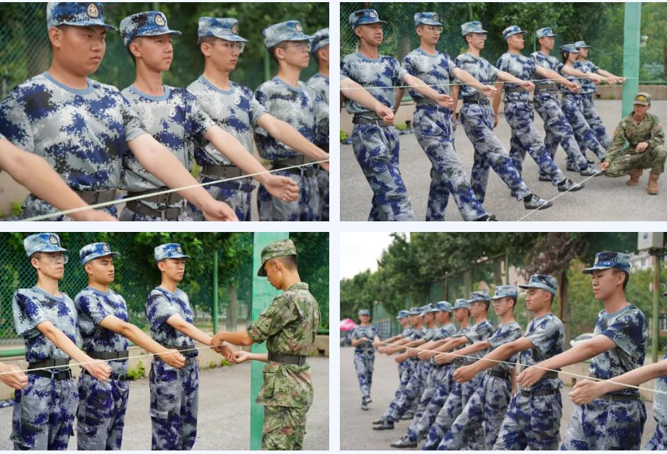 身着整齐迷彩,神情庄重,面对拉直的细绳,臂膀绷直,身姿挺拔如松,教官在一侧目光锐利地审视每个细节。